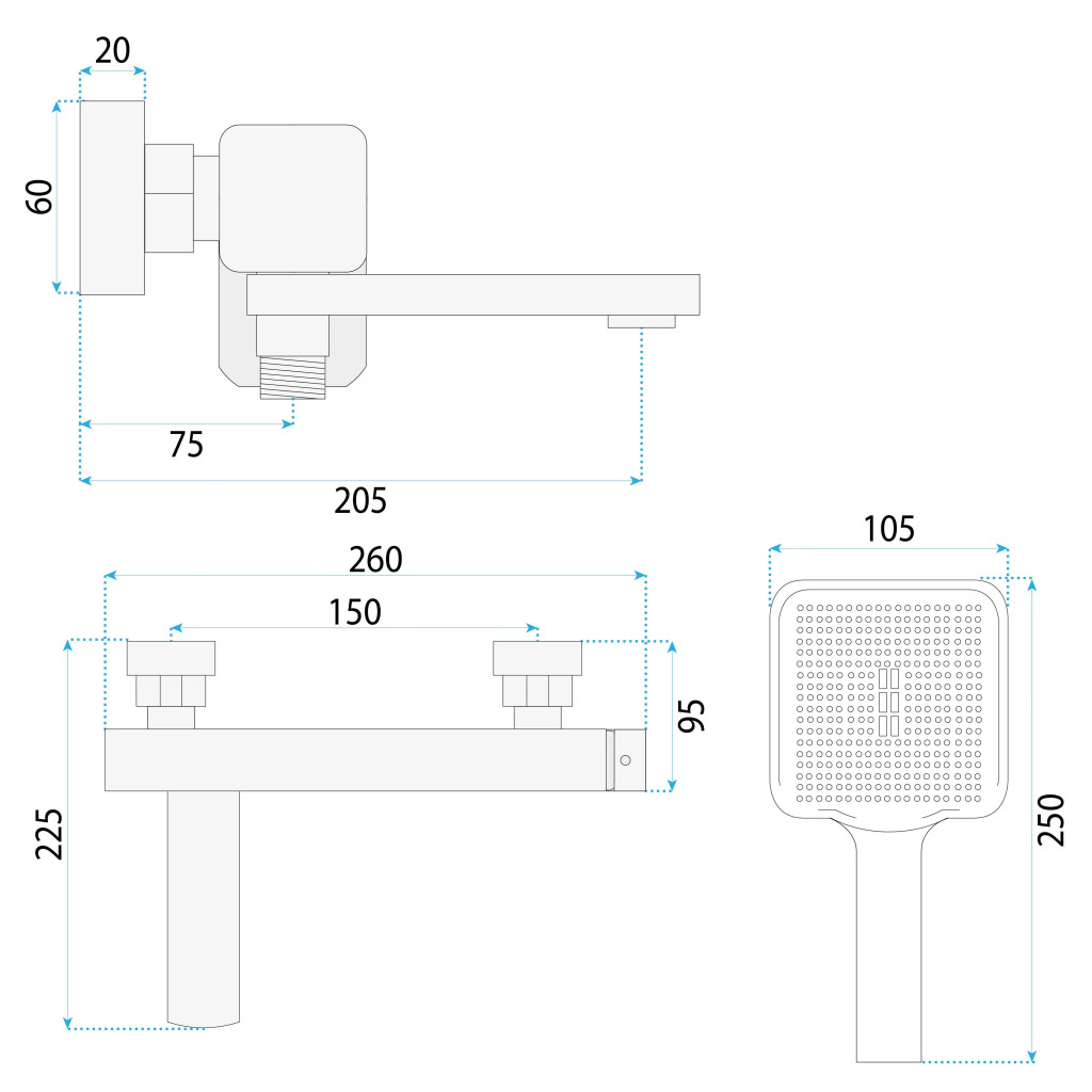 - Komplett zuhanyszett – a készlet tartalmazza a csaptelepet, a gégecsövet, valamint a stílusos, téglalap alakú kézizuhanyt fali tartóval, egységes szettként.