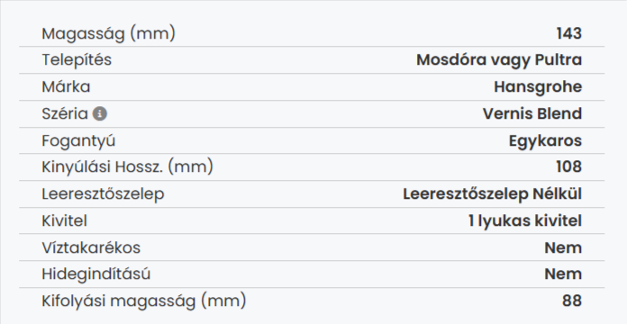 - Kifolyó magassága: 88 mm