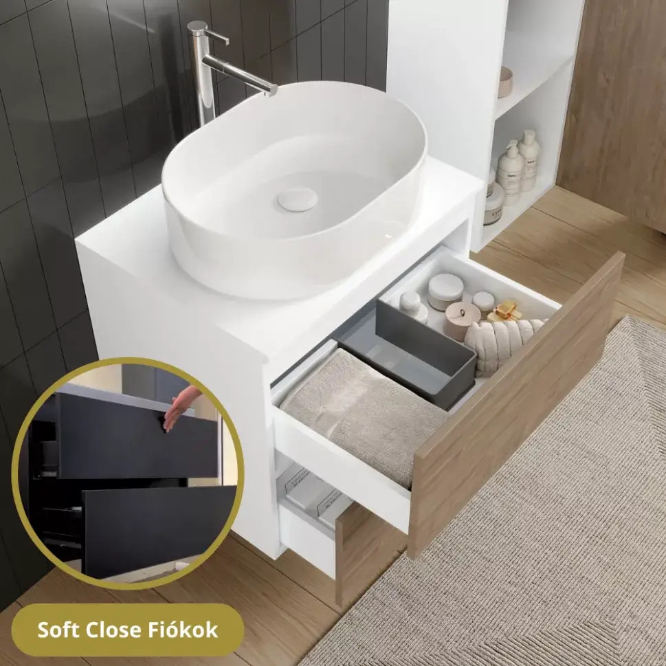 - selymes matt fehér mosdószekrény, teljes kihúzhatóságú fiókokkal
