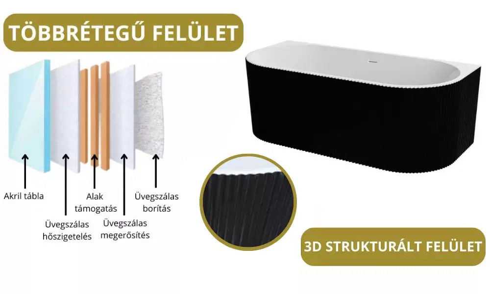 A fürdőkád műgyanta-üvegszálas erősítéssel készítik gyártáskor, aminek köszönhetően rendkívüli hőszigetelő képességgel rendelkezik. Ennek nagy előnye, hogy nem hűti el a vizet a kád felülete, így garantáljuk a hosszan tartó fürdőzést.