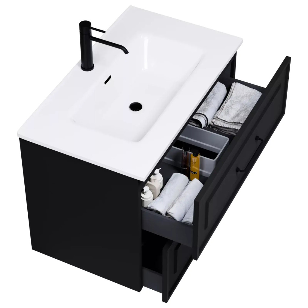 - matt fekete mosdószekrény, teljes kihúzhatóságú fiókokkal