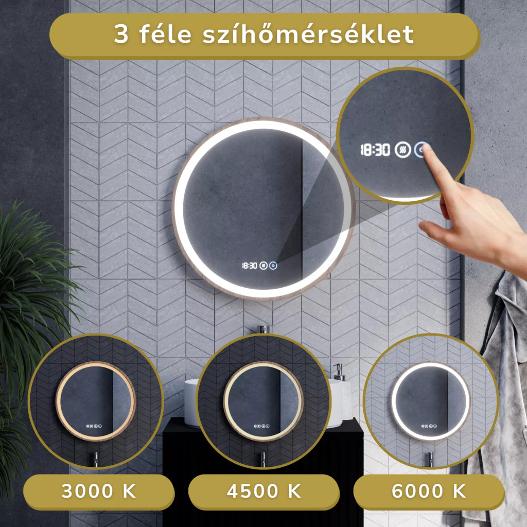 A tükör LED világítással rendelkezik, amely 3 féle színhőmérsékletet biztosít: meleg, semleges és hideg fehér.