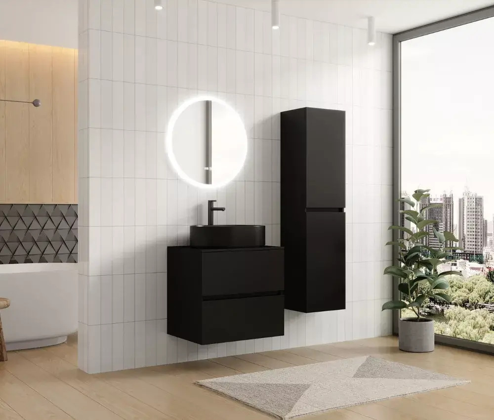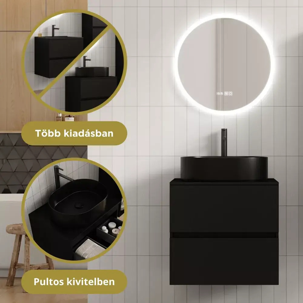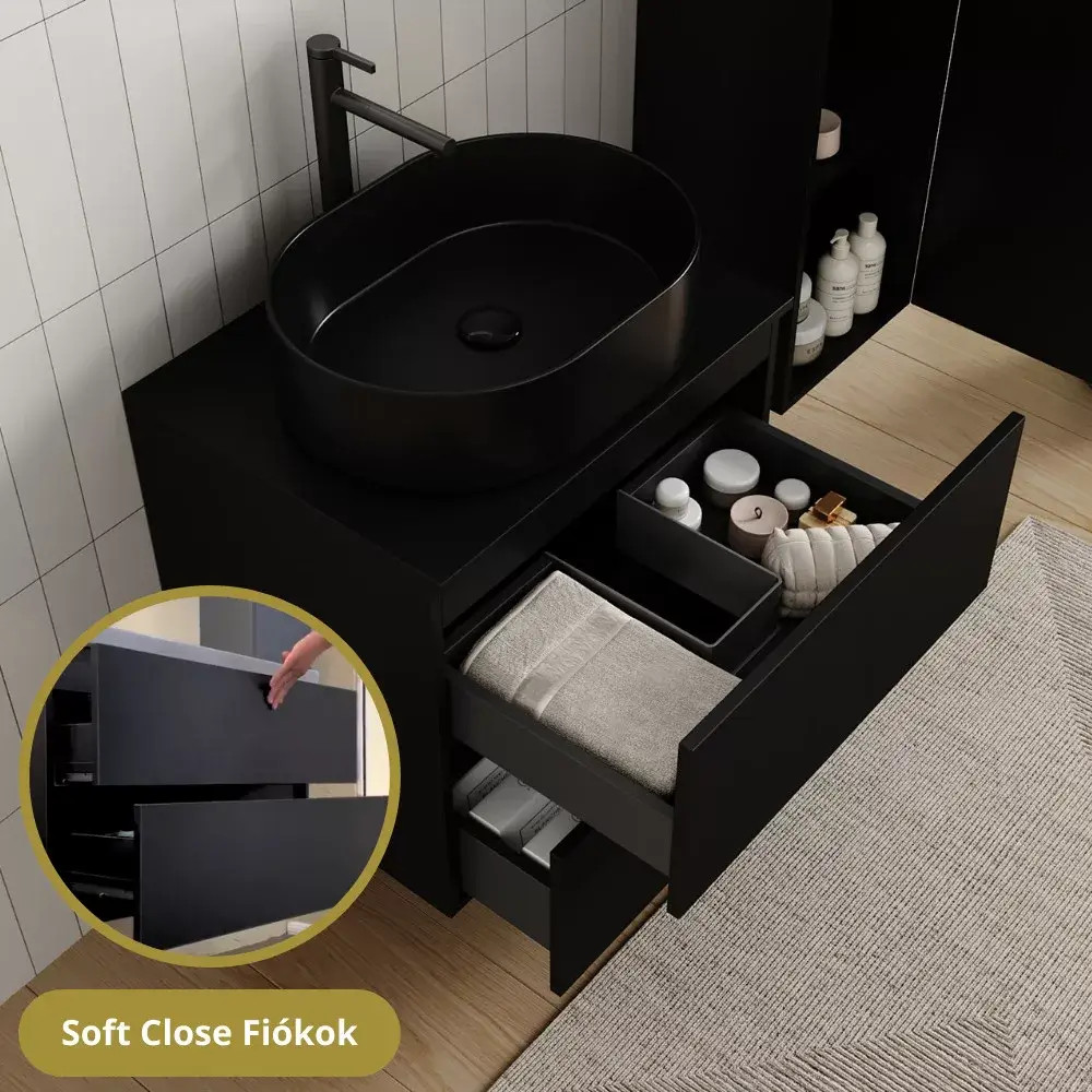 Napjainkban a praktikum mellett a fürdőszoba esztétikus megjelenése is fontos szempont. A függesztett bútorok egyre elterjedtebbé válnak, mivel számos előnnyel rendelkeznek, ide sorolható a modern, könnyed megjelenés és az egyszerű tisztítás. A függesztett fürdőszobai bútorok a klasszikus és modernebb stílusú fürdőszobákban is megállják a helyüket egyaránt. Nagyfokú rugalmasság jellemzi őket, mivel szinte bárhol elhelyezhetők a fürdőszobán belül. További előnyük, hogy soft close (csillapítós) zsanérral felszereltek, így becsukáskor az ajtó vagy fiók finoman záródik be, csökkentve a terhelést és növelve az élettartamot. A szekrény fehér és matt fekete mosdóval, illetve mosdópulttal is szabadon kombinálható ízlés szerint. A teljesség érdekében a mosdószekrényekhez illő LED okostükröt és magas szekrényt is választhatunk, hogy a fürdőszobában lévő bútorok egy szemet gyönyörködtető egységet alkossanak.