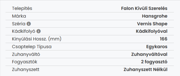 • kádtöltő átfolyási mennyisége 3 bar nyomás esetén: 22,5 l/perc