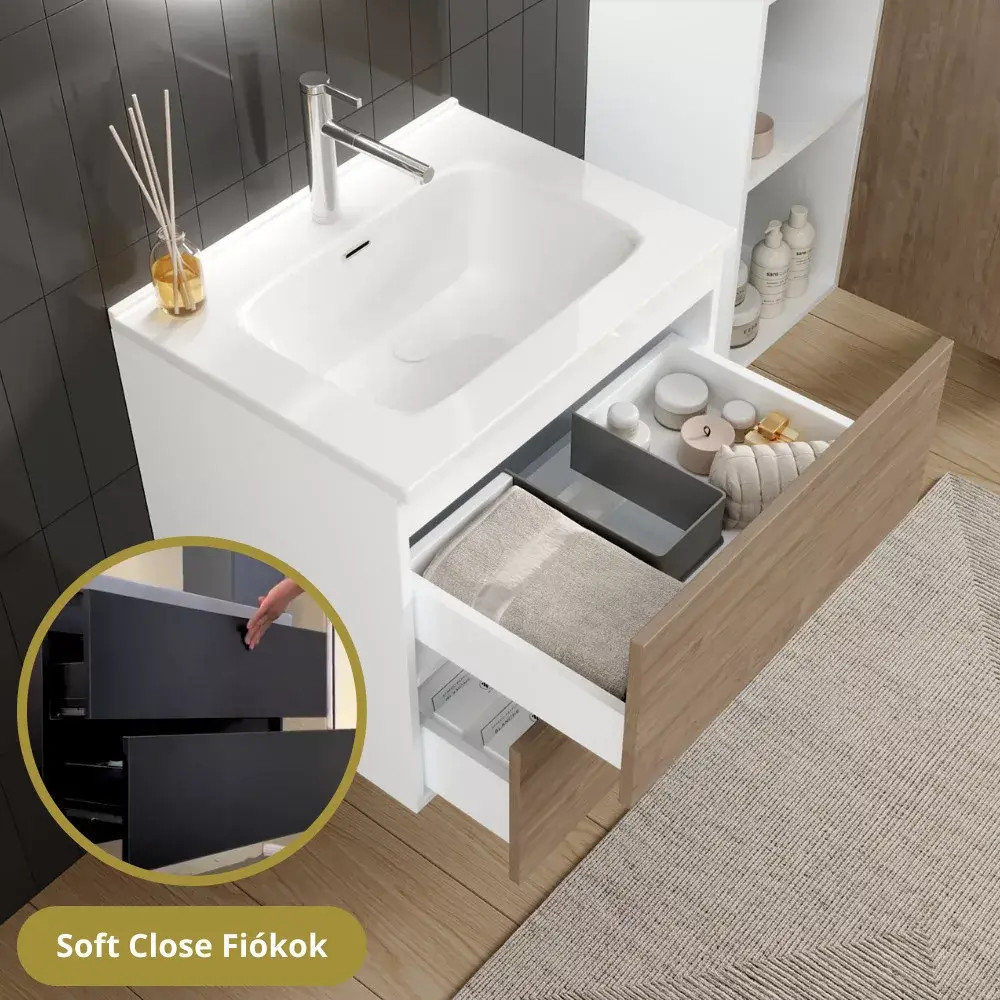Napjainkban a praktikum mellett a fürdőszoba esztétikus megjelenése is fontos szempont. A függesztett bútorok egyre elterjedtebbé válnak, mivel számos előnnyel rendelkeznek, ide sorolható a modern, könnyed megjelenés és az egyszerű tisztítás. A függesztett fürdőszobai bútorok a klasszikus és modernebb stílusú fürdőszobákban is megállják a helyüket egyaránt. Nagyfokú rugalmasság jellemzi őket, mivel szinte bárhol elhelyezhetők a fürdőszobán belül. További előnyük, hogy soft close (csillapítós) zsanérral felszereltek, így becsukáskor az ajtó vagy fiók finoman záródik be, csökkentve a terhelést és növelve az élettartamot. A szekrény fehér és matt fekete mosdóval, illetve mosdópulttal is szabadon kombinálható ízlés szerint. A teljesség érdekében a mosdószekrényekhez illő LED okostükröt és magas szekrényt is választhatunk, hogy a fürdőszobában lévő bútorok egy szemet gyönyörködtető egységet alkossanak.