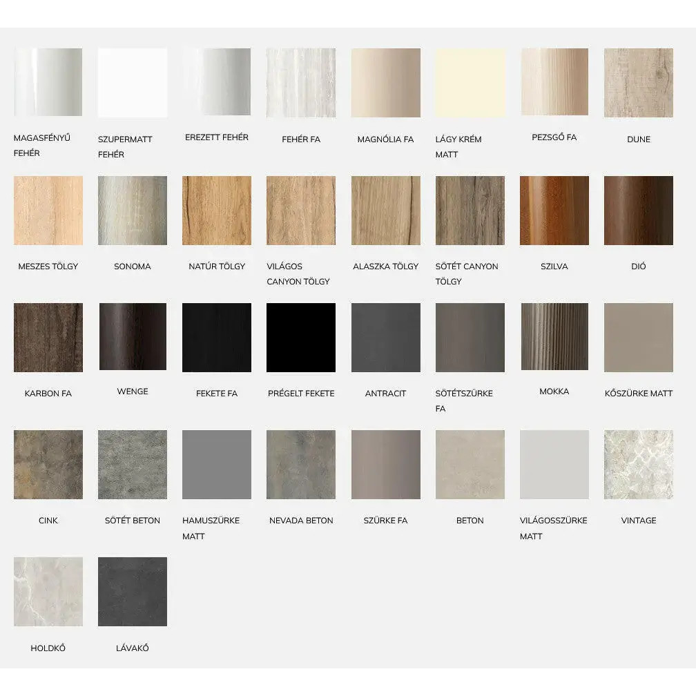 A bútor 34 féle színben rendelhető. Vásárlás előtt kérjük válassza ki az Ön számára megfelelő színt. A választható színek a képek között tekinthetők meg, melyek a különböző kijelzőbeállítások miatt, a valóságtól minimálisan eltérhetnek. Alsó szekrény színválasztéka: magasfényű fehér, szupermatt fehér, erezett fehér, fehér fa, magnólia fa, lágy krém matt, pezsgő fa, dune, meszes tölgy, sonoma, natúr tölgy, világos canyon tölgy, alaszka tölgy, sötét canyon tölgy, szilva, dió, karbon fa, wenge, fekete fa, prégelt fekete, lávakő, antracit, szürke fa, mokka, kőszürke matt, cink, sötét beton, hamuszürke matt, nevada beton, sötétszürke fa, beton, világosszürke matt, vintage, holdkő. Ha extrát szeretne rendelni, kérjük válassza ki a kiegészítő termékek közül és tegye kosárba. A terméket készre szerelve szállítjuk.