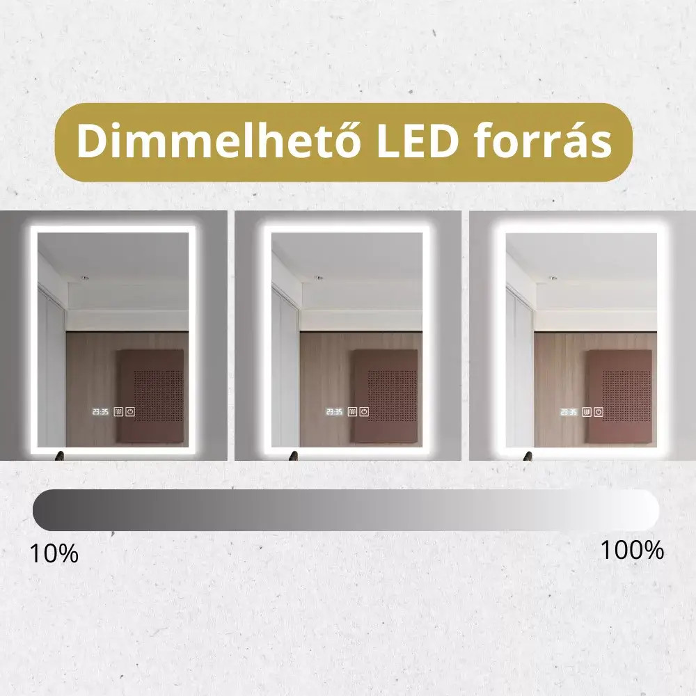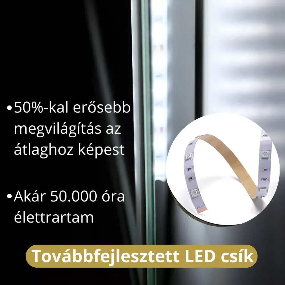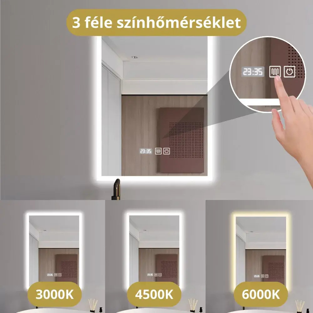 A tükör LED világítással rendelkezik, amely 3 féle színhőmérsékletet biztosít: meleg, semleges és hideg fehér.