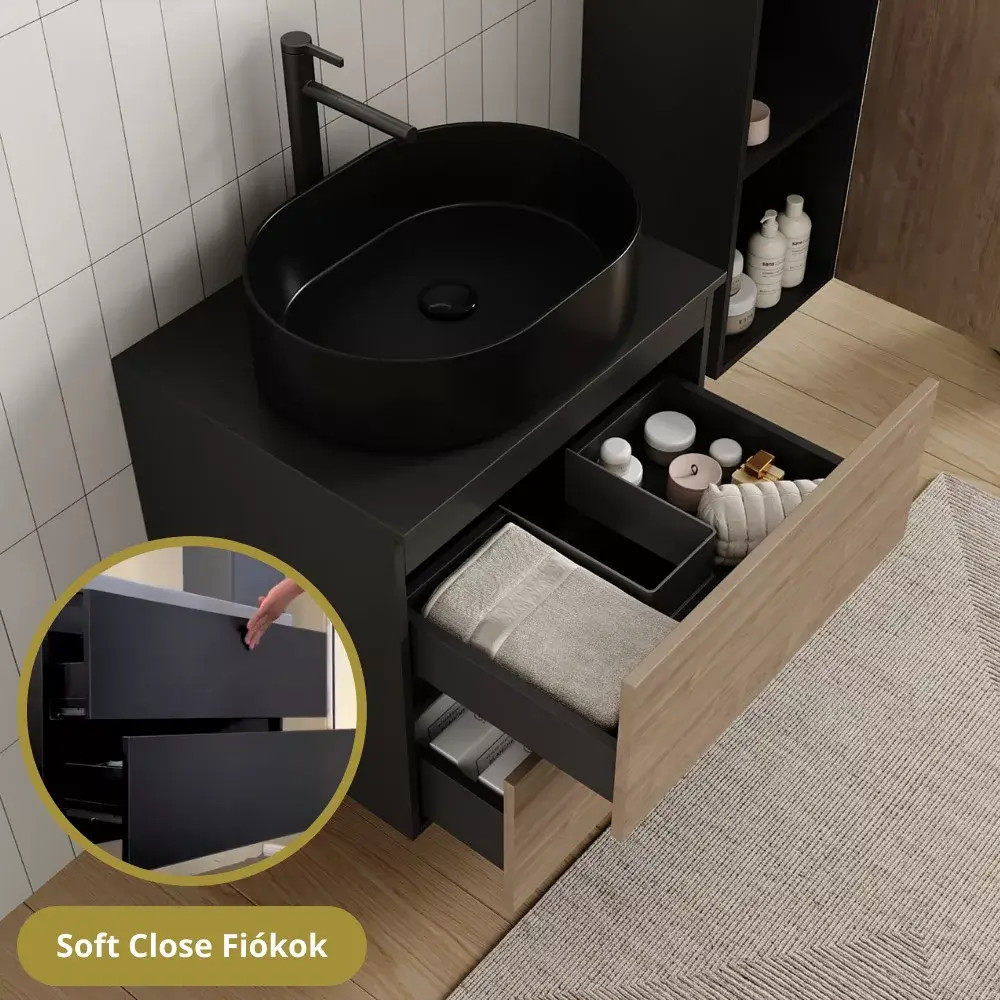 Napjainkban a praktikum mellett a fürdőszoba esztétikus megjelenése is fontos szempont. A függesztett bútorok egyre elterjedtebbé válnak, mivel számos előnnyel rendelkeznek, ide sorolható a modern, könnyed megjelenés és az egyszerű tisztítás. A függesztett fürdőszobai bútorok a klasszikus és modernebb stílusú fürdőszobákban is megállják a helyüket egyaránt. Nagyfokú rugalmasság jellemzi őket, mivel szinte bárhol elhelyezhetők a fürdőszobán belül. További előnyük, hogy soft close (csillapítós) zsanérral felszereltek, így becsukáskor az ajtó vagy fiók finoman záródik be, csökkentve a terhelést és növelve az élettartamot. A szekrény fehér és matt fekete mosdóval, illetve mosdópulttal is szabadon kombinálható ízlés szerint. A teljesség érdekében a mosdószekrényekhez illő LED okostükröt és magas szekrényt is választhatunk, hogy a fürdőszobában lévő bútorok egy szemet gyönyörködtető egységet alkossanak.